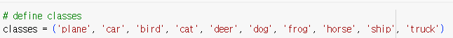 CIRAR10 데이터셋은 32*32 크기의 컬러 이미지 60000개로 구성되어 있으며 10개의 classes로 분류됨. training dataset 이미지가 50000개, test dataset 이미지가 10000개임.