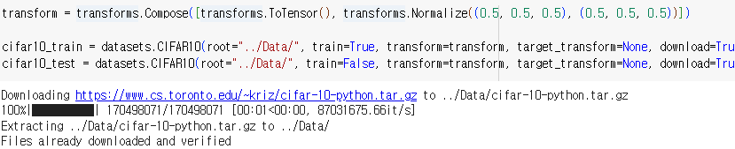 datasets.CIFAR10(root="../Data/", train=True, transform=transform, target_transform=None, download=True): 이 부분은 CIFAR-10의 훈련 데이터셋을 다운로드하고 전처리된 형태로 불러옴