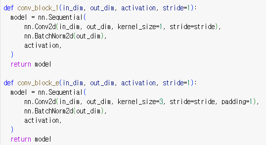 def conv_block_1(in_dim, out_dim, activation, stride=1): 이 함수는 1x1 컨볼루션(convolution) 블록을 정의하는 부분입니다.