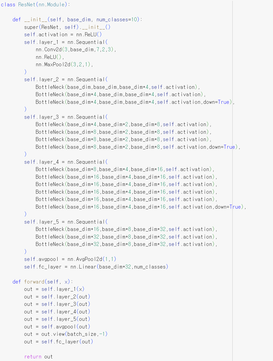 - self.layer_5: 이 레이어는 이전 레이어에서의 출력 채널 수가 base_dim * 16이고, 출력 채널 수가 base_dim * 32인 Bottleneck 블록 세 개를 순차적으로 쌓습니다.