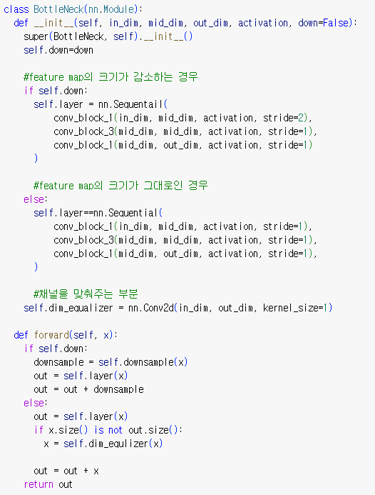 forward 메서드: 이 메서드는 BottleNeck 블록의 순전파(forward) 과정을 정의합니다. 만약 down 파라미터가 True라면 입력 feature map을 다운샘플링하고, 그렇지 않은 경우는 그대로 유지합니다. 또한 해당 모듈에 입력으로 들어온 feature map과 모듈 내에서 계산된 feature map을 더해주어 정보가 흐를 수 있도록 합니다. 최종적으로 Bottleneck 블록의 출력을 반환합니다.