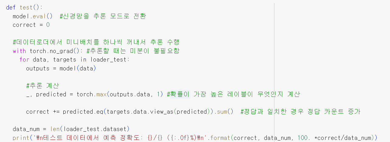- eq는 element-wise equality를 수행하는 메서드입니다. 즉, predicted와 targets.data.view_as(predicted)의 각 요소를 비교하여, 같은 위치에 있는 값이 동일하면 True, 다르면 False를 반환합니다.