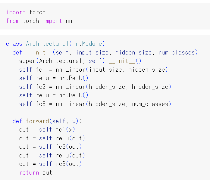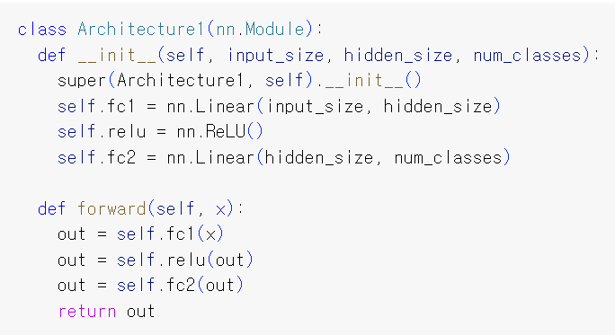 다음과 같이 클래스를 사용하여 구현한 인공신경망이 있다고 가정해보자.
