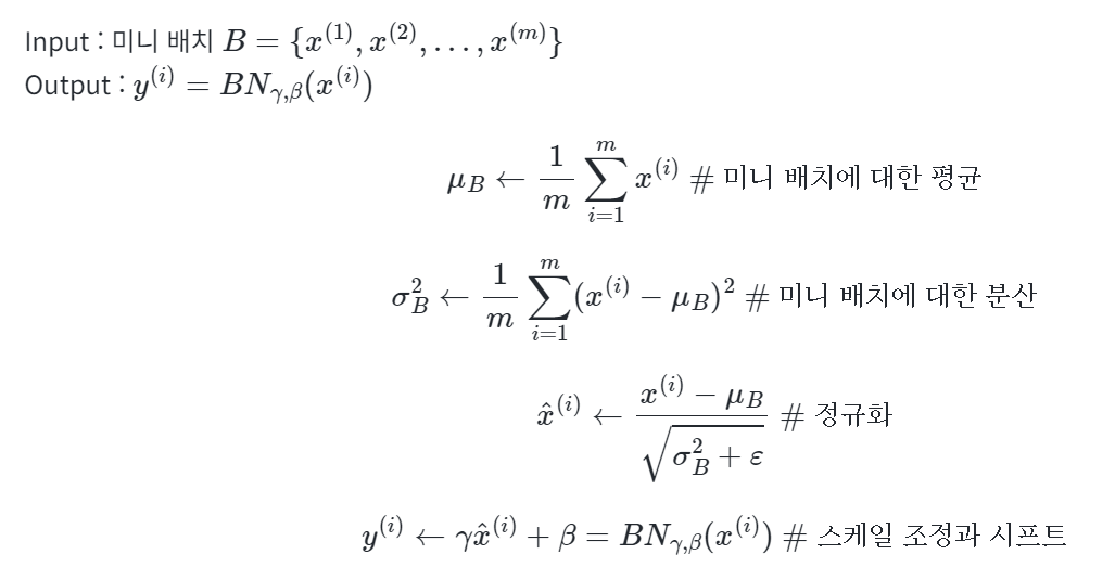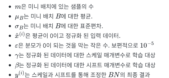 배치 정규화의 수식은 다음과 같다(BN은 배치 정규화를 의미함)
