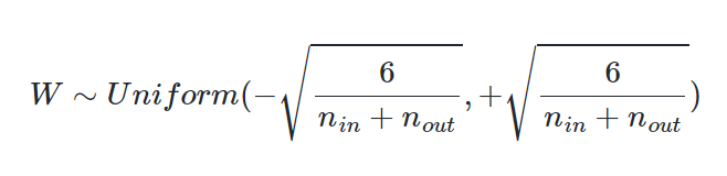 이 방법은 균등 분포(Uniform Distribution)로 초기화 하는 경우 또는 정규 분포(Normal distribution)로 초기화하는 경우 두 가지로 나뉘며, 이전 층의 뉴런 개수와 다음 층의 뉴런 개수를 가지고 식을 세운다. 이전 층의 뉴런의 개수를 n in, 다음 층의 뉴런의 개수를 n out이라고 해보자.
