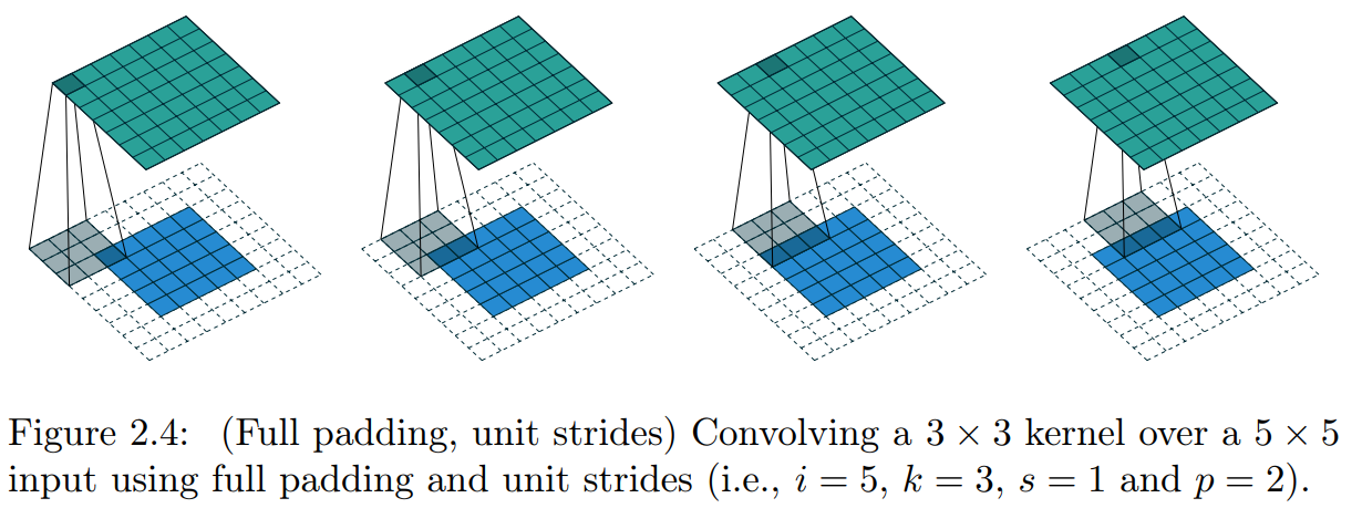 커널을 입력 feature map에 대해 가능한 모든 부분 또는 완전한 겹침을 고려하기 때문에 full padding이라고 함.