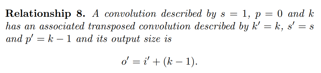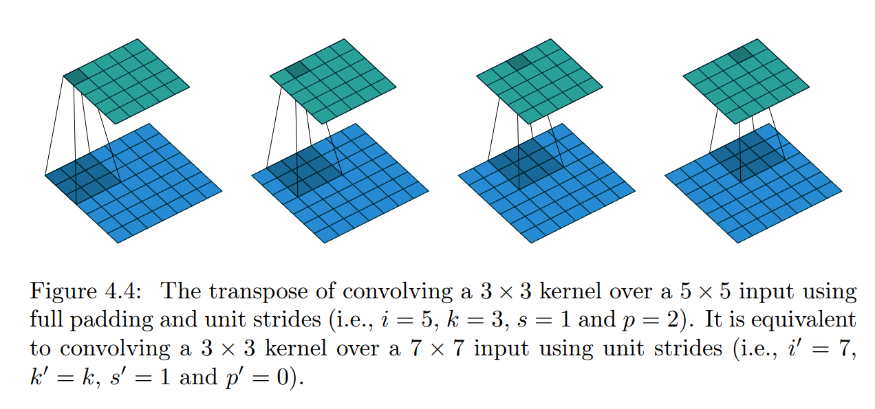 Figure 2.1로 보자면, 이 합성곱의 전치는 2x2에 적용될 때 4x4의 출력을 가지게 될 것임.