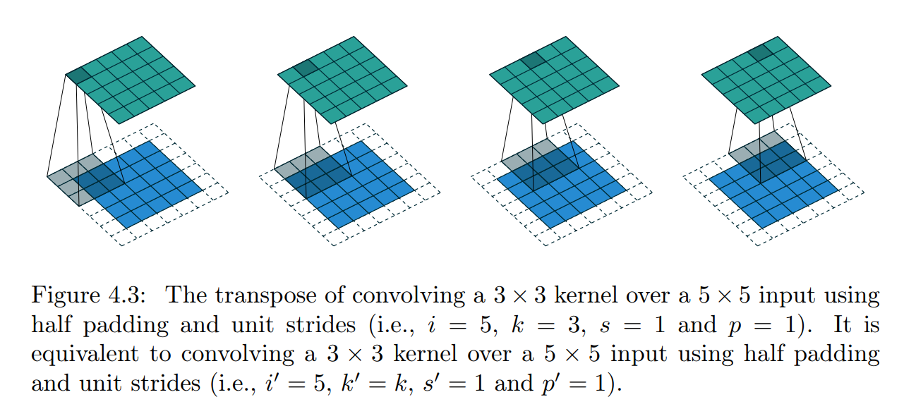 5x5 input에 3x3 kernel, half padding(즉 1칸 제로패딩)의 경우 output이 input과 마찬가지로 5x5 사이즈이다.