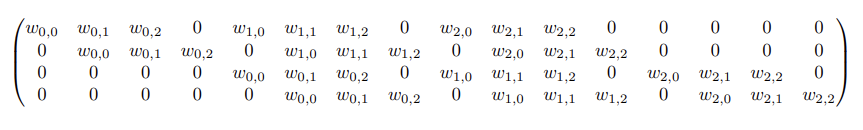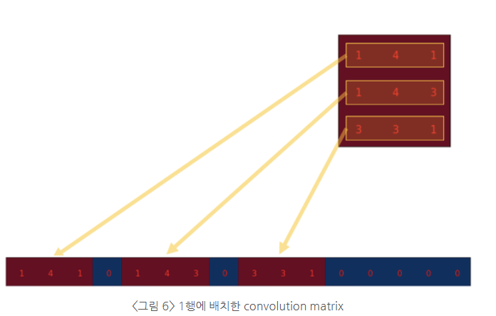 3 x 3의 kernel로 input에서 convolution 연산을 4번 진행했으므로 행이 4개가 됨. 그림5에서 1행은 convolution 연산이 처음 진행되었을 때 kernel이 적용되었던 위치를 넣은 것. kernel의 윗줄에서부터 가중치를 적용함. 한 줄이 적용될 때마다 사이에 0이 들어감.