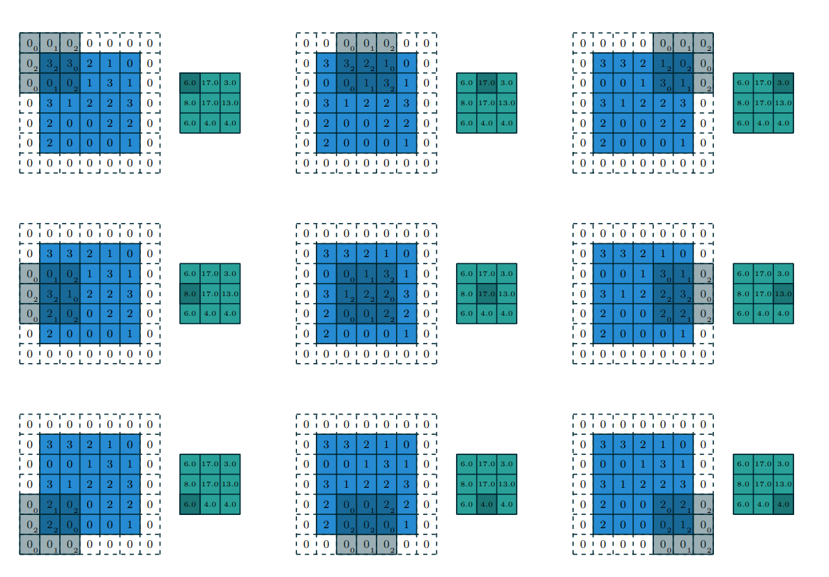 행렬 내의 0은 출력 특징 맵의 해당 위치에서 입력과 커널 간의 상호작용이 없는 경우를 나타냄. 이것은 합성곱이 커널을 입력 위로 슬라이딩하면서 일부 경우에는 커널의 일부가 입력과 겹치지 않을 수 있기 때문.