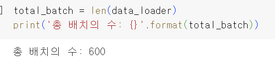 총 배치의 수는 600이다. batch_size=100으로 했으므로 훈련 데이터는 60,000개이다.
