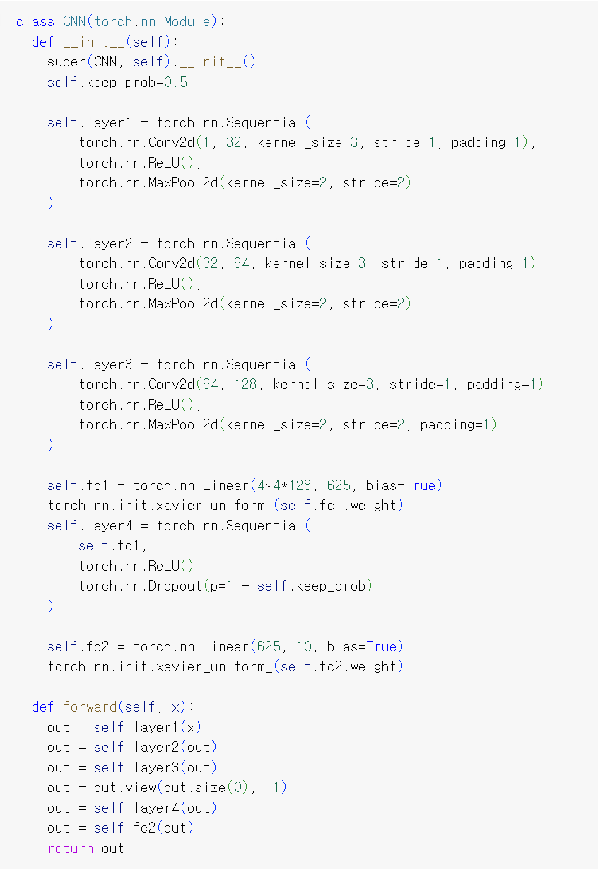 모델의 아키텍처는 총 5개의 층으로 구성된다. 앞서 배운 CNN 모델과 1번 레이어와 2번 레이어는 동일하고 새로운 합성곱층과 전결합층을 추가한다.
