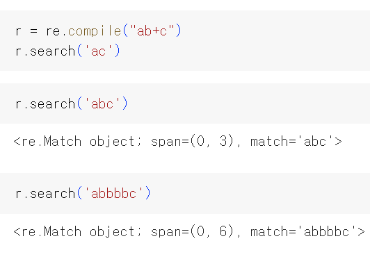 + 는 *와 유사하다. 다른 점은 앞의 문자가 최소 1개 이상이어야 한다는 점이다. 정규 표현식이 ab+c 라고 하면 ac는 매치되지 않는다.