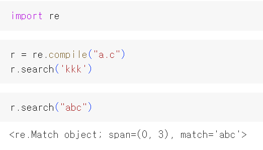 앞으로 진행될 실습에서는 re.compile( )에 정규 표현식을 컴파일하고, re.search( )를 통해서 해당 정규 표현식이 입력 텍스트와 매치되는지를 확인하면서 각 정규 표현식에 대해 이해한다. re.search( )는 매치된다면 Match Object를 리턴하고 매치되지 않으면 아무 값도 출력되지 않는다.