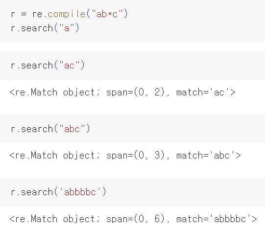 * 은 바로 앞의 문자가 0개 이상일 경우를 나타낸다. 앞의 문자는 존재하지 않을 수도 있으며, 여러 개일 수도 있다. 정규 표현식이 ab*c라면 ac, abc, abbc, abbbc 등과 매치할 수 있으며 b의 개수는 무수히 많을 수 있다.