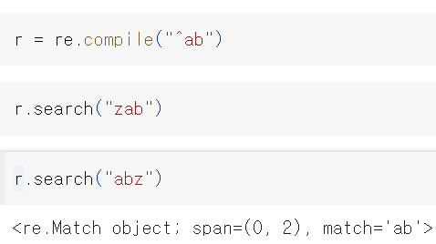 ^ 는 시작되는 문자열을 지정한다. 정규표현식이 ^ab라면 문자열 ab로 시작되는 경우에 매치한다.