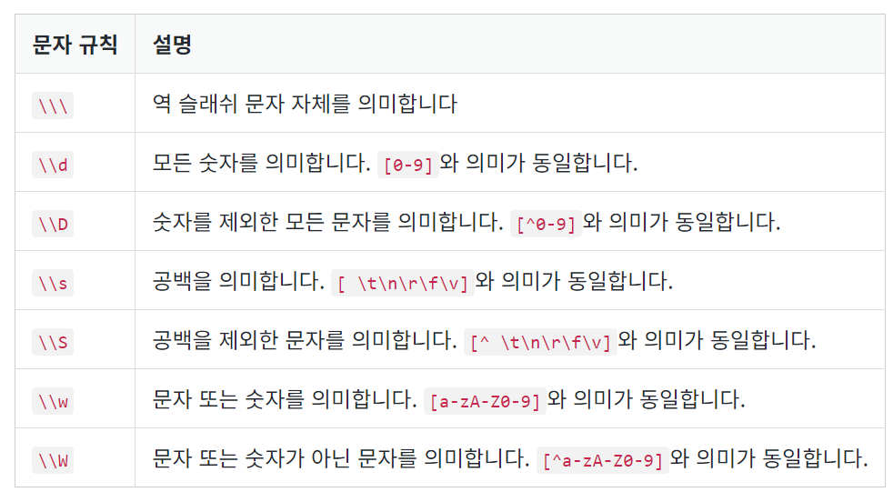 정규 표현식 문법에는 역 슬래쉬(|)를 이용하여 자주 쓰이는 문자 규칙들이 있다.