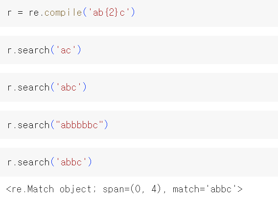 문자에 해당 기호를 붙이면 해당 문자를 숫자만큼 반복한 것이 나타난다. 정규 표현식이 ab{2}c 라면 a와 c 사이에 b가 존재하면서 b가 2개는 문자열에 대해 매치한다.