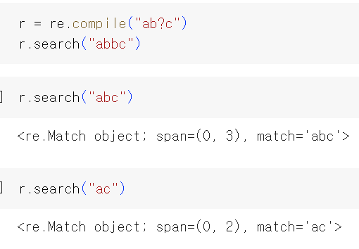 ?는 ? 앞에 문자가 존재할 수도 있고, 존재하지 않을 수도 있는 경우를 나타낸다. 예를 들어 정규 표현식이 ab?c라고 할 때 이 경우 정규 표현식에서의 b는 있다고 취급할 수도 있고 없다고 취급할 수도 있다. 즉 abc와 ac 모두 매치할 수 있다.