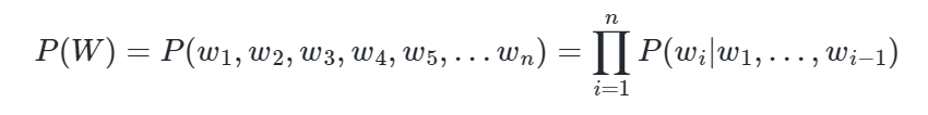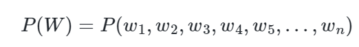 하나의 단어를 w, 단어 시퀀스를 대문자 W라고 한다면, n개의 단어가 등장하는 단어 시퀀스 W의 확률은 다음과 같다.