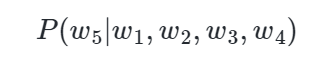 | 기호는 조건부 확률을 의미한다. 예를 들어 다섯번째 단어의 확률은 아래와 같다.