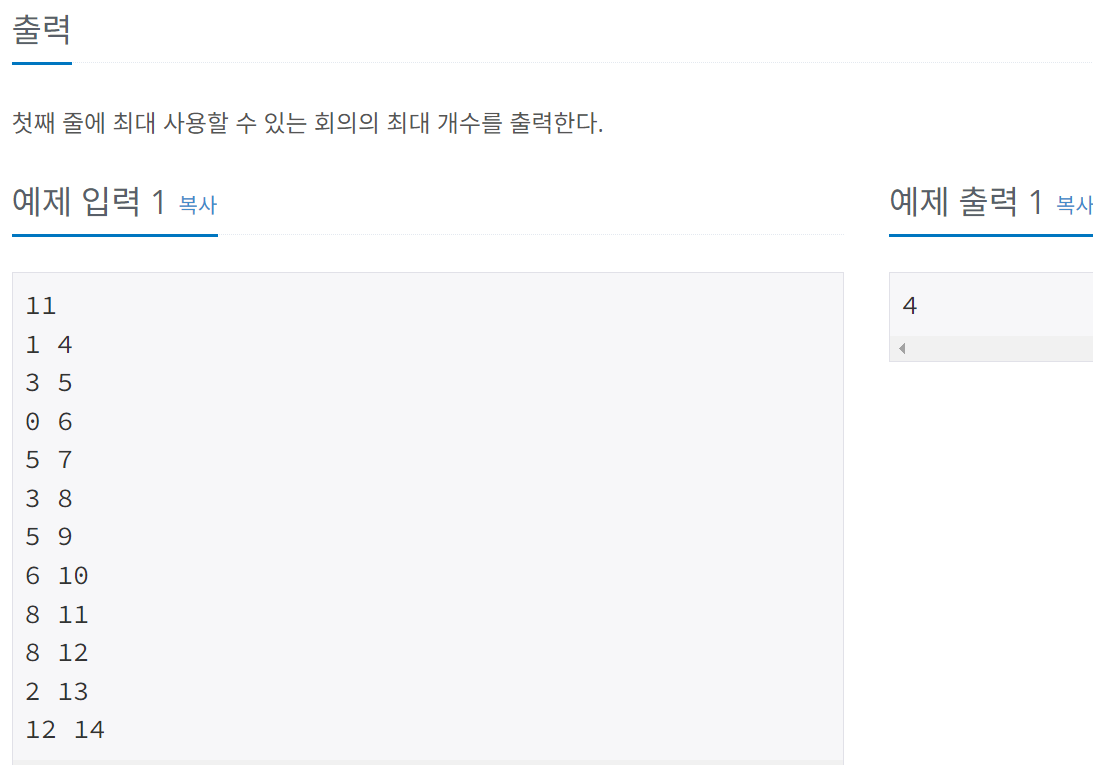 이 문제는 N개의 회의에 대해 회의를 가장 많이 할 수 있는 최대 횟수를 구하는 문제이다.