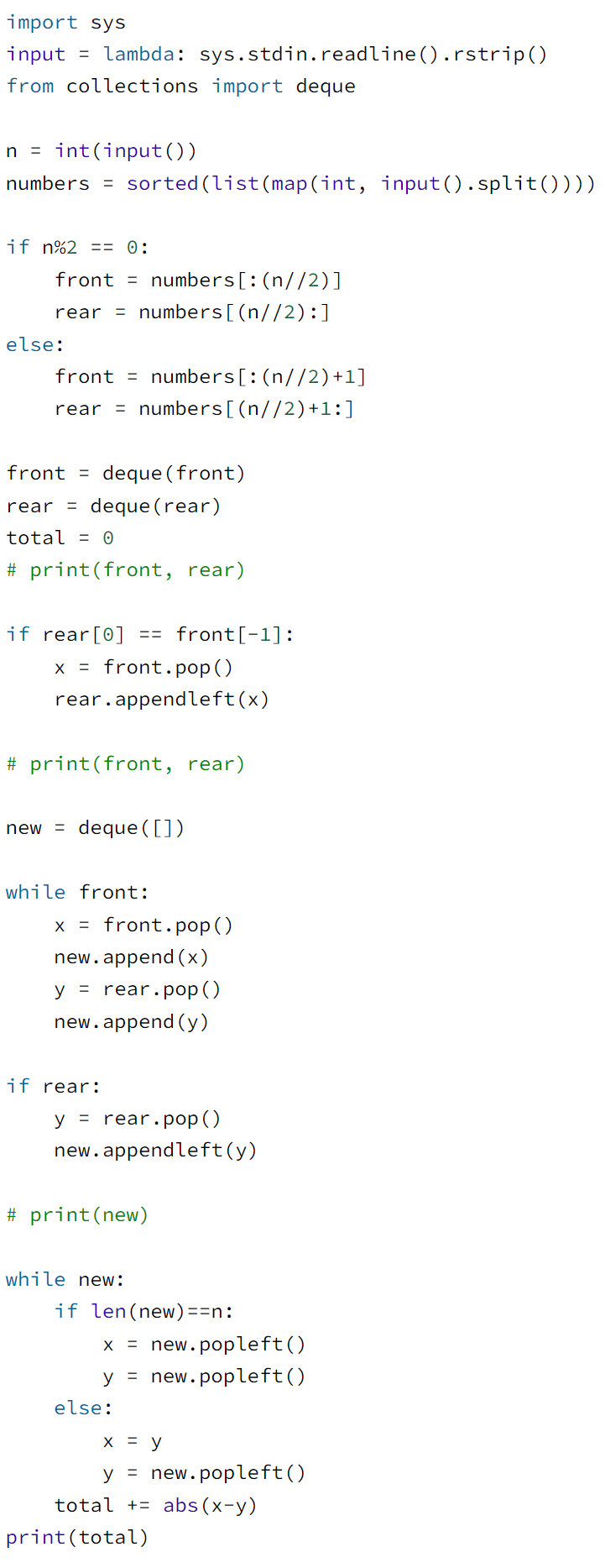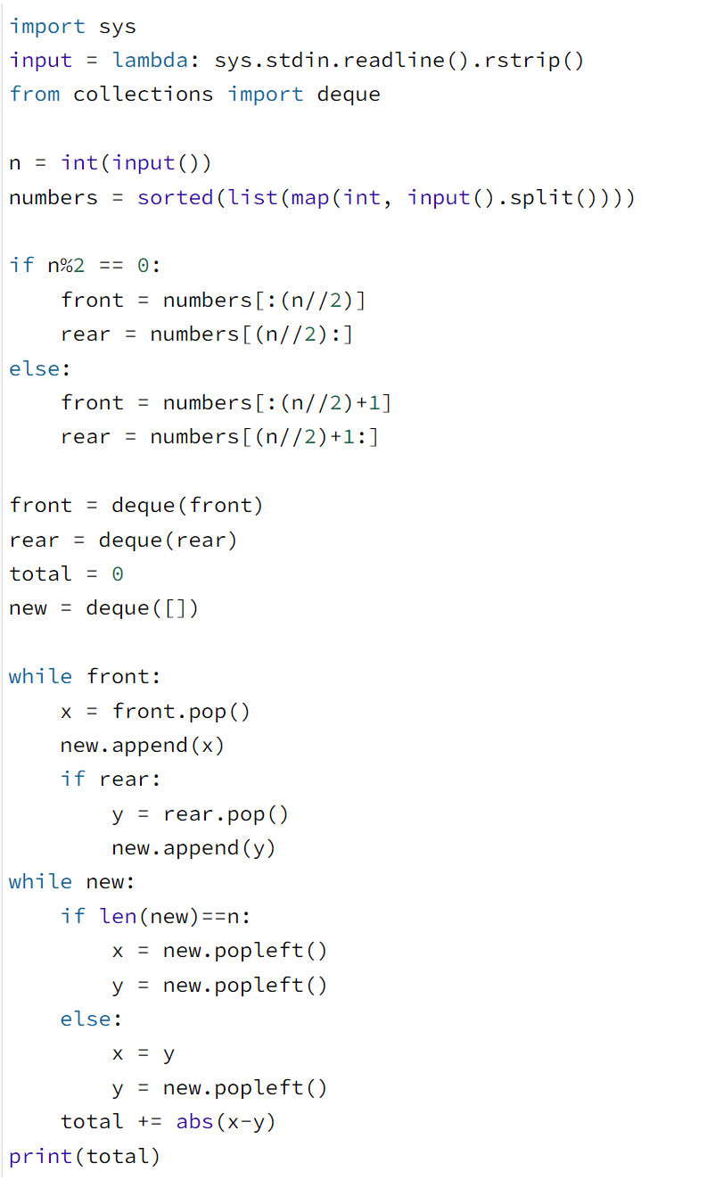 위의 문제는 n개의 수가 주어졌을 때 수의 순서를 적절히 바꾸어서 두 수의 차의 절대값이 가장 커지도록 하는 문제이다.