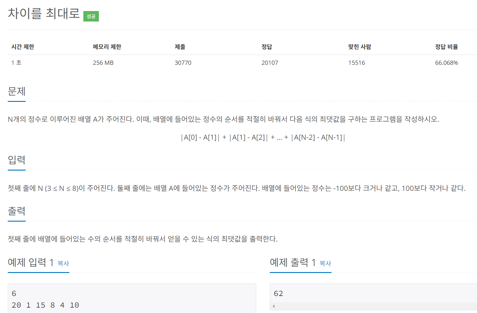 ♣ 백준 알고리즘 10819번(휴리스틱)