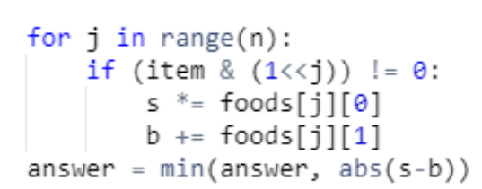 이런 식으로 부분 집합이 가지는 신맛과 쓴맛을 계산해서 그 차를 구한다. 그리고 그 중 가장 작은 값을 answer에 부여한다.