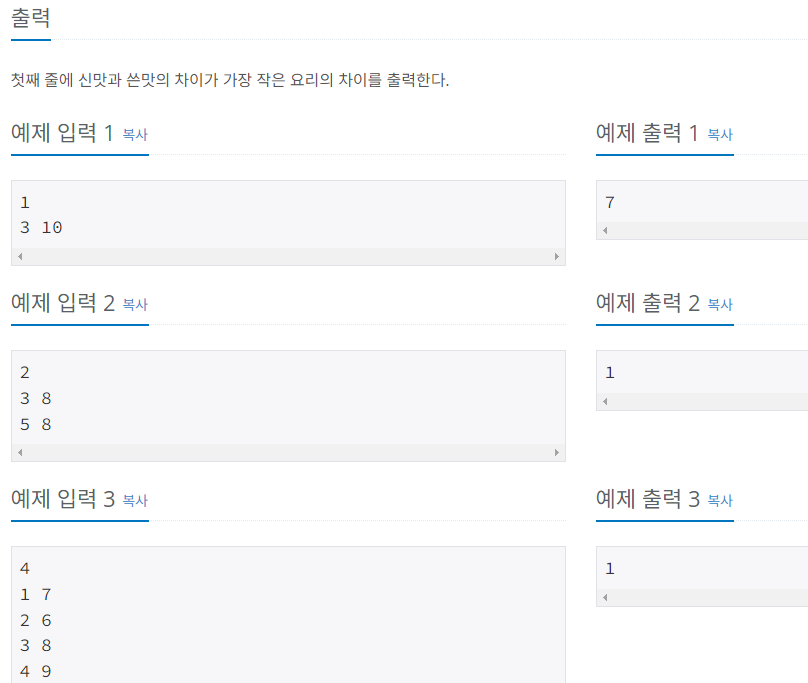 음식을 만드는데, 한 가지 이상의 재료를 사용해야 하는 문제이다. 각 재료에는 신맛과 쓴맛이 모두 들어가고, 요리를 만들고 나서 요리에서 나는 신맛은 들어간 재료의 신맛을 모두 곱한 값이고, 쓴맛은 들어간 재료의 쓴맛을 모두 합한 값이다.
