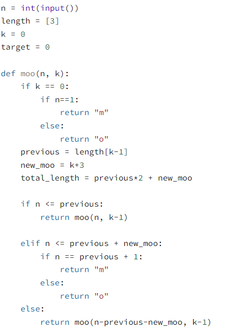 2. 예외 처리가 되지 않을 때는 이전 단계의 Moo 수열의 길이, 중간에 들어갈 m + o *(k+2) 의 길이, 이번 단계의 Moo 수열의 길이를 이용하여 세 가지 경우로 나눈다.