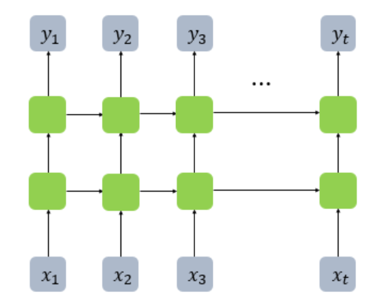 RNN도 다수의 은닉층을 가질 수 있다. 아래 그림은 순환 신경망에서 은닉층이 1개 더 추가되어 은닉층이 2개인 깊은 순환 신경망의 모습을 보여준다. 첫 번째 은닉층은 다음 은닉층에 모든 시점에 대해서 은닉 상태값을 보내주고 있다.