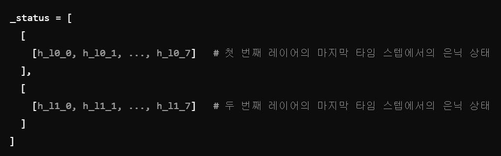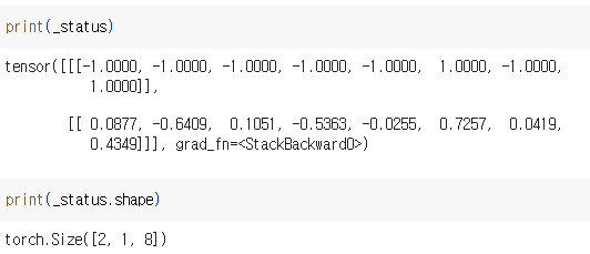 두 번째 리턴값인 _status는 층이 1개였던 RNN cell 때와 달라졌다. 이 크기는(층의 개수, 배치 크기, 은닉 상태의 크기)에 해당한다. _status는 각 레이어의 마지막 시점에서의 은닉 상태이다. 그렇기 때문에 outputs의 마지막 값과 _status의 마지막 값이 두 번째 레이어의 마지막 시점에서의 은닉 상태로, 값이 같다.