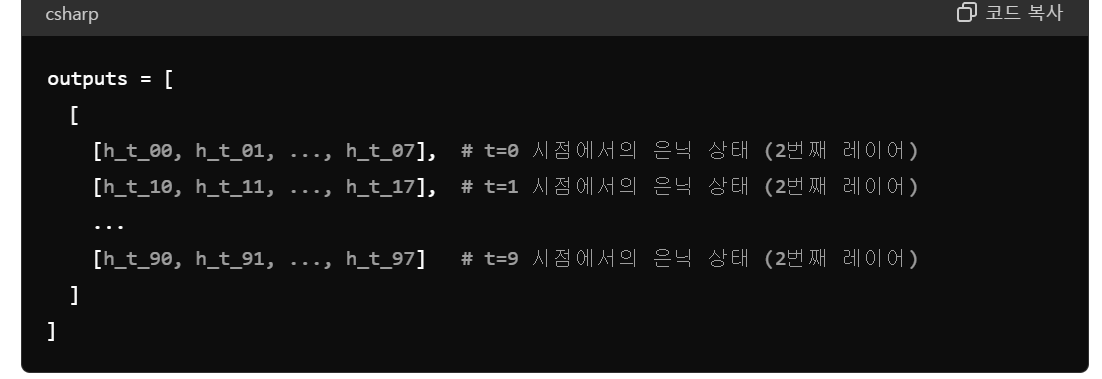 첫 번째 리턴값인 outputs의 크기는 층이 한 개였던 RNN 셀 때와 달라지지 않았다. 이는 마지막 층의 모든 시점의 은닉 상태들을 보여준다.