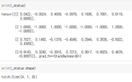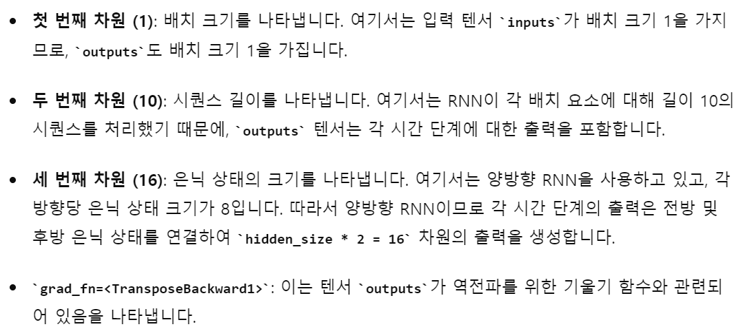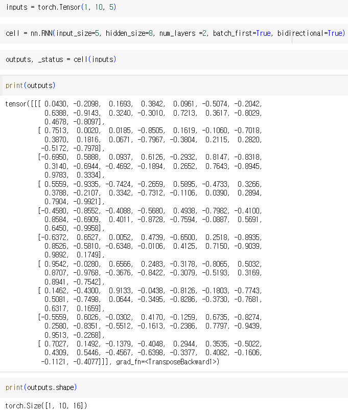 첫 번째 리턴값의 크기가 단방향 RNN을 셀 때보다 은닉 상태가 두 배가 되었다. 양방향의 은닉 상태값들이 연결되었기 때문이다.