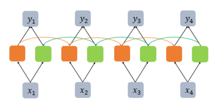 양방향 RNN은 하나의 출력값을 예측하기 위해 기본적으로 두 개의 메모리 셀을 사용한다. 첫 번째 메모리 셀은 앞에서 배운 것처럼 앞 시점의 은닉 상태(forward states)를 전달받아 현재의 은닉 상태를 계산한다. 주황색이 앞 시점의 은닉 상태를 전달받은 셀이다. 두 번째 메모리 셀은 뒤 시점의 은닉 상태를 전달 받아 현재의 은닉 상태를 계산한다. 초록색 메모리 셀에 해당한다. 두 개의 값이 모두 출력값을 예측하기 위해 사용된다.