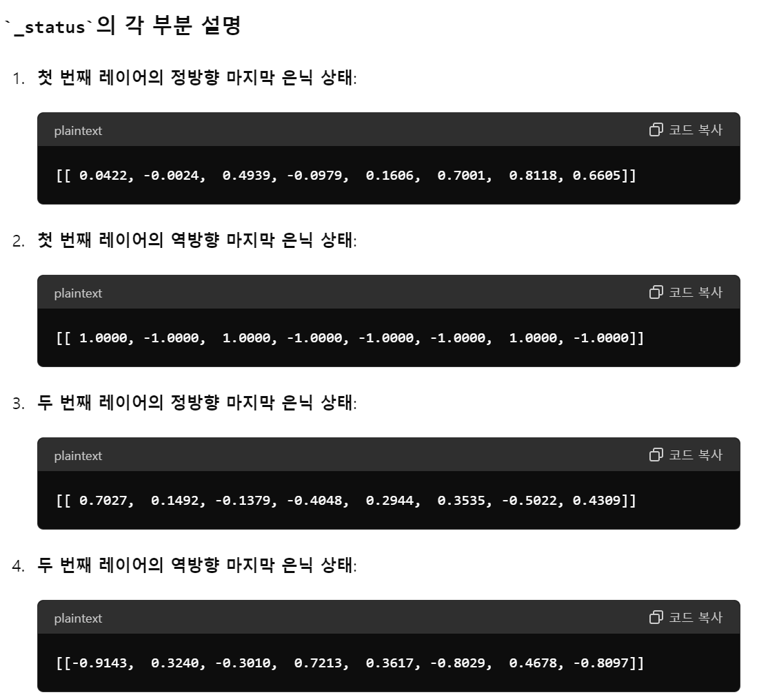두번째 리턴값의 크기는 (층의 개수 x 방향의 , 배치 크기, 은닉 상태의 크기)를 가진다. 이는 정방향 기준으로는 마지막 시점에 해당되면서, 역방향 기준에서는 첫번째 시점에 해당되는 시점의 출력값을 층의 개수만큼 쌓아 올린 결과값이다.