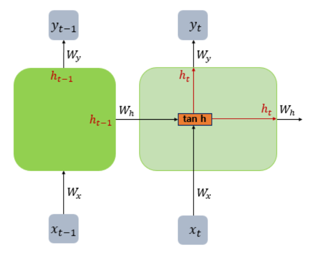 위 그림은 바닐라 RNN의 내부 구조이다(편향 b는 생략).