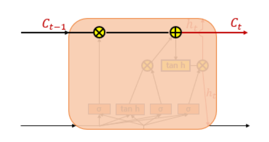 셀 상태는 위의 그림에서 왼쪽에서 오른쪽으로 가는 굵은 선이다. 이전 시점의 셀 상태가 다음 시점의 셀 상태를 구하기 위한 입력으로 사용된다.