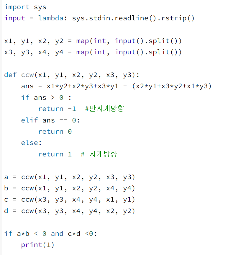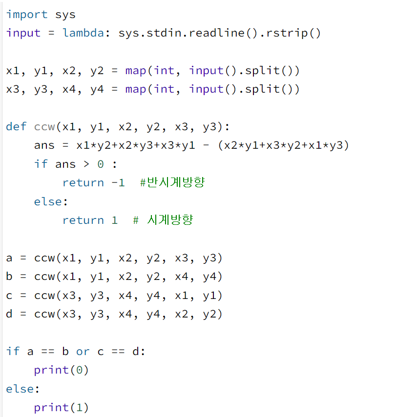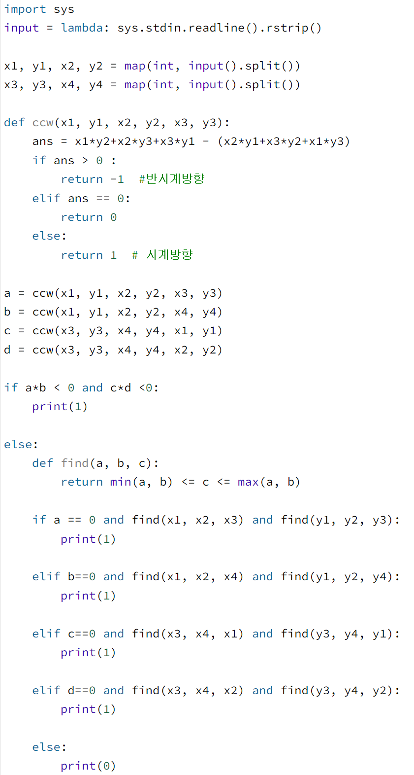 먼저, 첫 번째 문제와는 조금 달리 ans==0 인 경우도 ccw 함수에 넣는다. 그리고 네 가지 경우(a, b, c, d)를 계산한다.