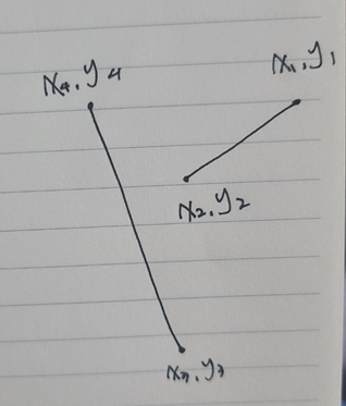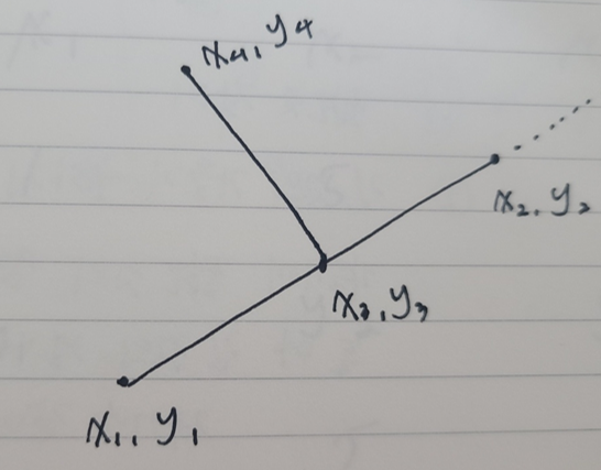 2) x1, y1 - x2, y2 위에 x4, y4 가 있을 때