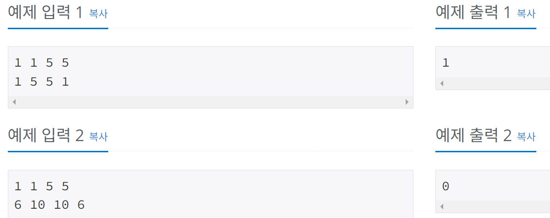 이번 문제는 한 선분의 끝 점이 다른 선분이나 끝 점 위에 있는 경우도 포함하는 문제이다. 즉 위에서 인정했던 경우의 수(한 선분에 대해 다른 선분의 한 점은 시계 방향에, 다른 한 점은 반시계 방향에 있을 것)에 더해서 한 선분 위에 다른 선분의 한 점이 있는 경우도 교차하는 것으로 인정한다.