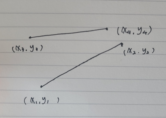 1) x1, y1 - x2, y2 에 대해 x3, y3 와 x4, y4가 모두 시계 방향에 있을 때