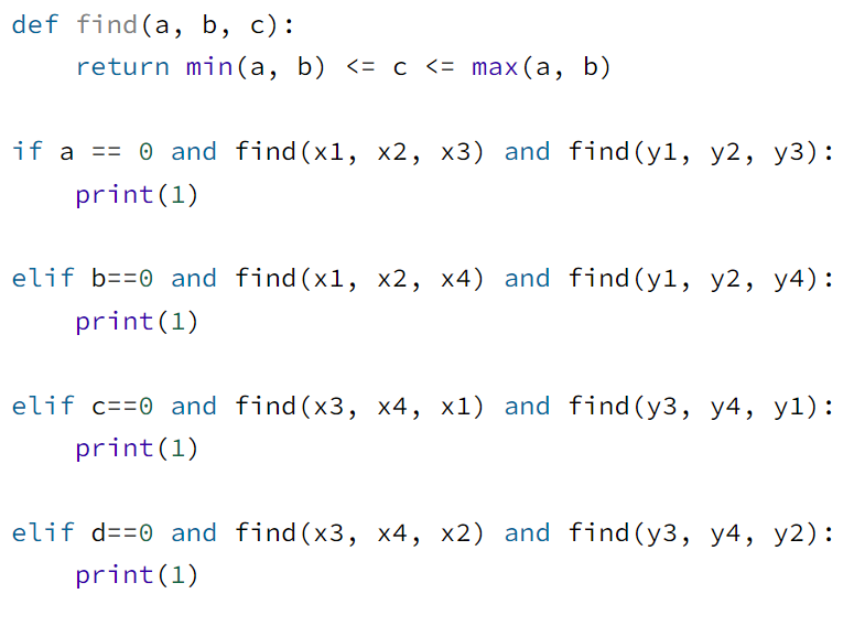 한 점이 한 선분 위의 두 점 사이에 존재하는지 판단하는 find 함수를 만들어서 네 가지 경우를 판별한다.