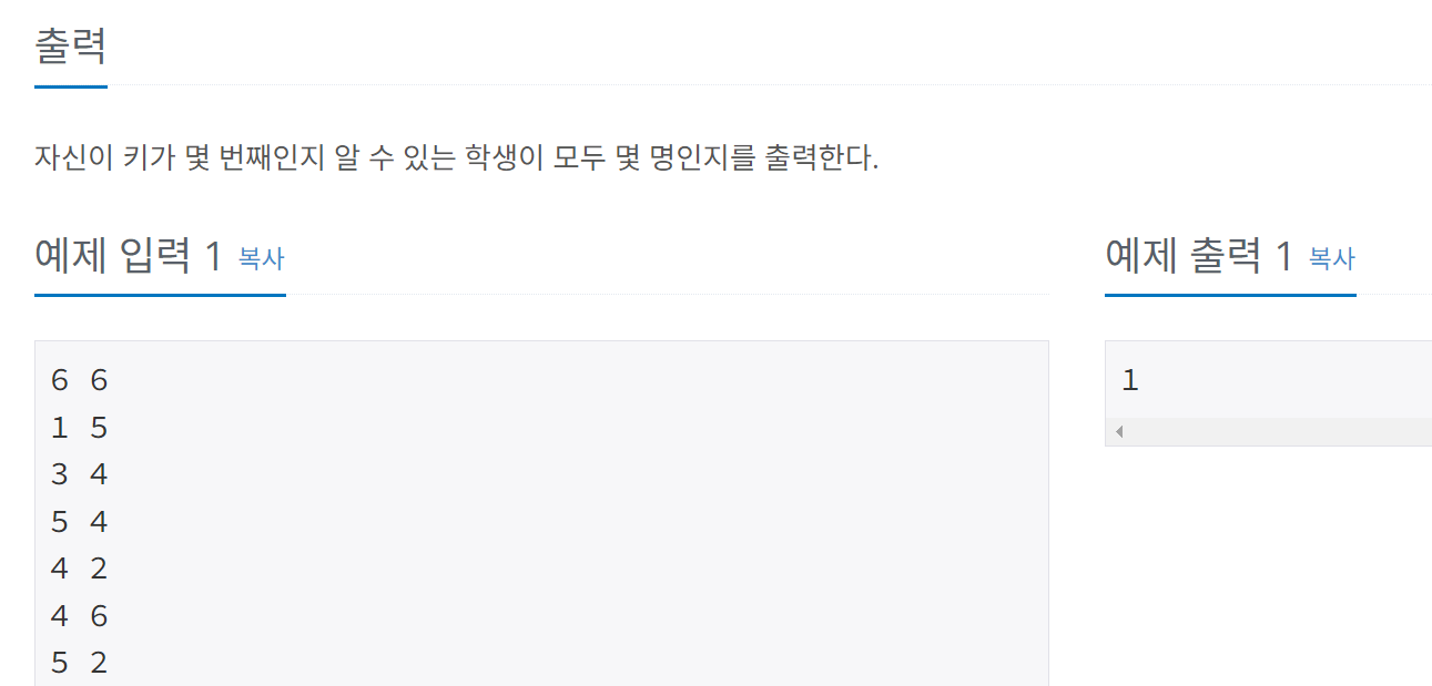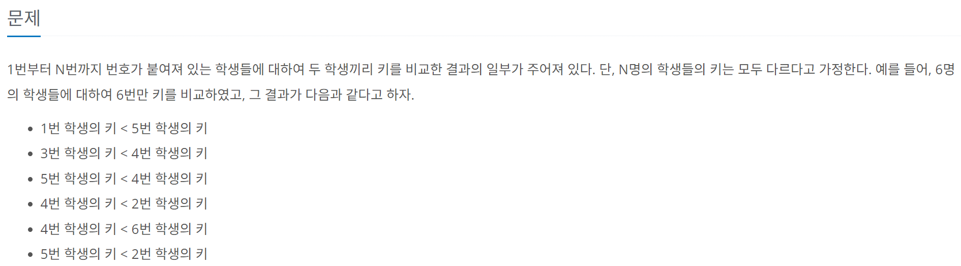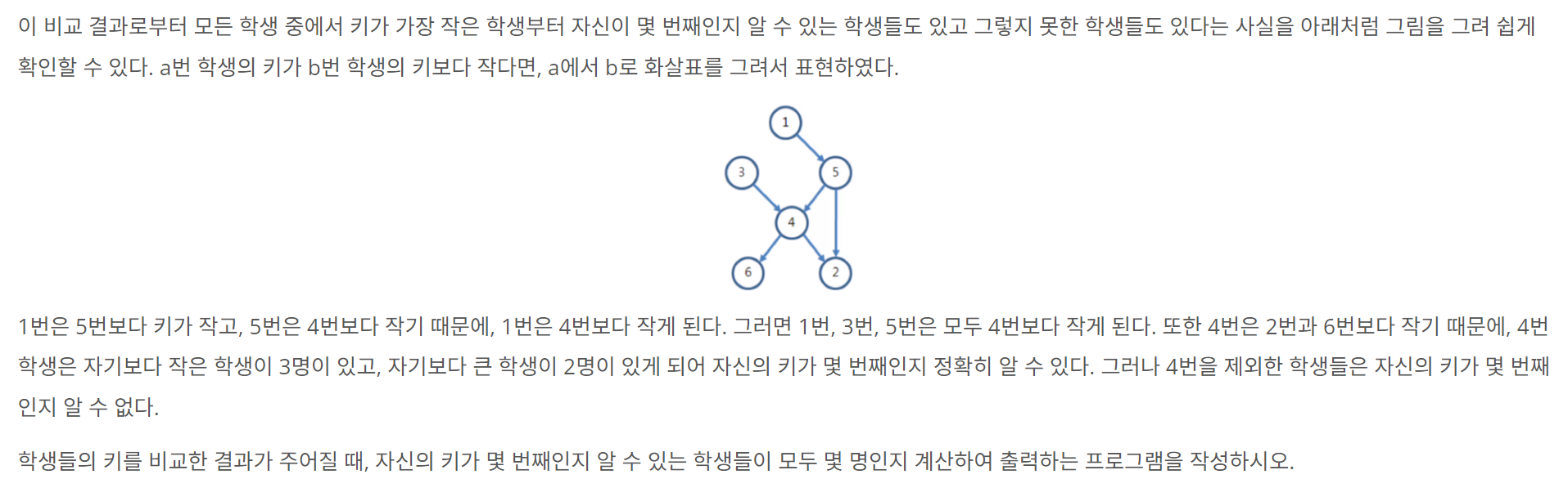학생들의 키를 노드처럼 그래프를 만들어 비교하는 문제이다. 예제 입력을 이용하여 학생들의 키를 비교한 결과를 최대한 연결하면 아래와 같다.