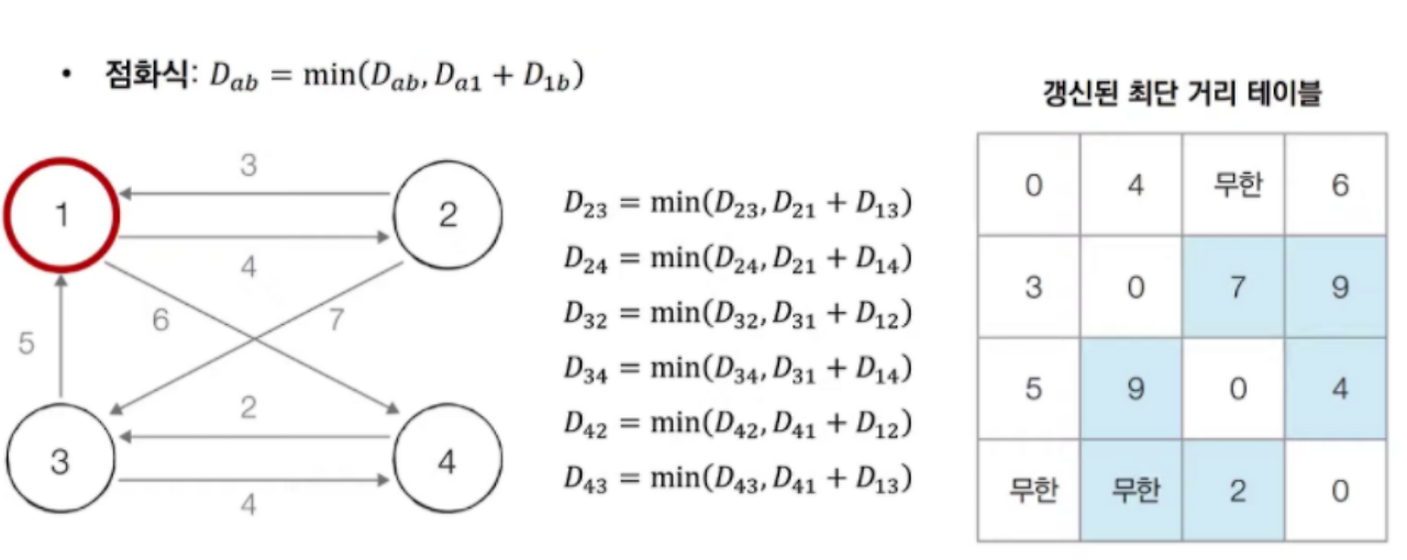 모든 지점에서 다른 모든 지점까지의 최단 거리를 저장하기 때문에 2차원 테이블에 최단 거리 정보를 저장하며, 이는 DP 알고리즘에 속한다. 따라서 DP에서 배운 것처럼 점화식을 사용한다. 처음에는 모든 거리를 '무한'으로 두고, 각 노드를 거쳐서 갈 수 있는 방법을 탐색하며 최단 거리를 갱신한다.