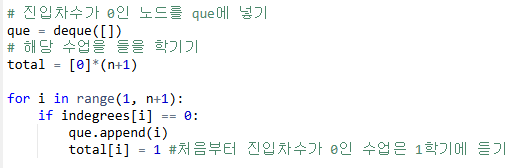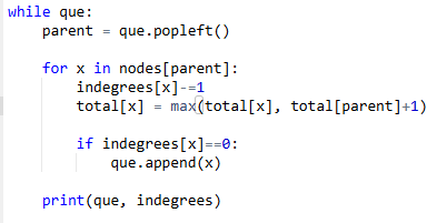 que에서 진입차수가 0인 노드를 순차적으로 꺼내서 해당 노드의 자식 노드(즉 선수 관계를 갖는 노드)를 탐색한다. parent가 자식 노드에 전입하므로 전입차수를 빼준다. (indegrees[x] -=1 ) 자식 노드를 이수해야 하는 학기는 total[x]와 total[parent]+1 중 제일 큰 것으로 설정한다. 왜냐하면 x에 진입차수가 여러 개일 수 있는데, 모든 선수관계를 다 지켜야 하기 때문에 모든 선수관계를 모두 고려한 최댓값이 답이 되어야 한다.