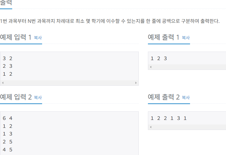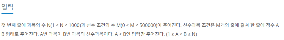 이 문제는 전형적인 위상정렬 알고리즘으로 해결할 수 있다. 입력을 보면 첫째 줄에 과목의 수(N)와 선수 조건의 수(M)가 주어진다. 선수과목 조건은 M개의 줄에 걸쳐 A, B 형태로 주어지는데, A번 과목이 B 과목의 선수 과목이다. 주어진 A, B의 크기는 항상 A < B 이다. 선수 관계를 지켜서 모든 과목을 이수할 때, 각 과목을 이수하는 데 걸리는 최소 학기를 구한다.