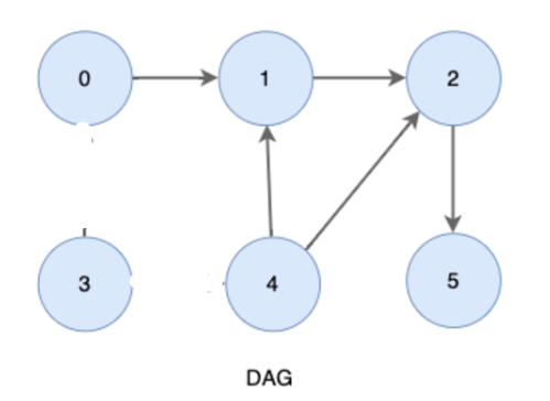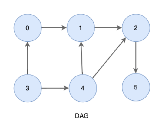 위상정렬은 사이클이 없는 방향 그래프의 모든 노드를 방향성에 거스르지 않도록 순서대로 나열하는 것을 의미한다. 아래와 같은 비순환 방향 그래프(DAG: Directed Acyclic Graph) 에서 가능하다.