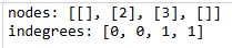 1번에서 2번으로 전입하므로 nodes[1]에 2가 들어있고, 2번에서 3번으로 전입하므로 nodes[2]에 3이 들어있다. 또한 2, 3 노드가 각각 전입차수를 1개씩 가지고 있어서 indegrees는 [0, 0, 1, 1] 이 된다.
